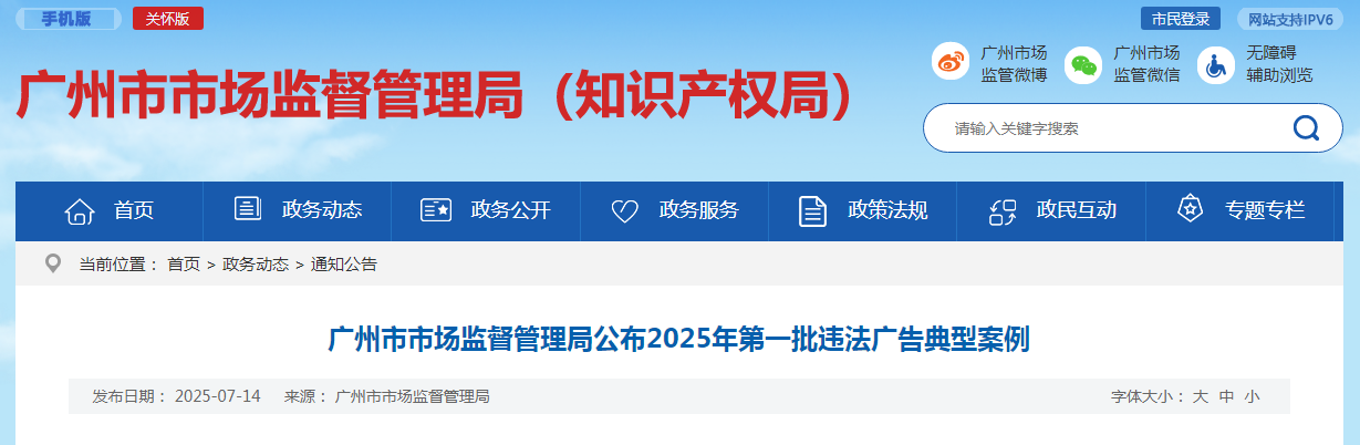 廣州市市場監督管理局公布2025年第一批違法廣告典型案例