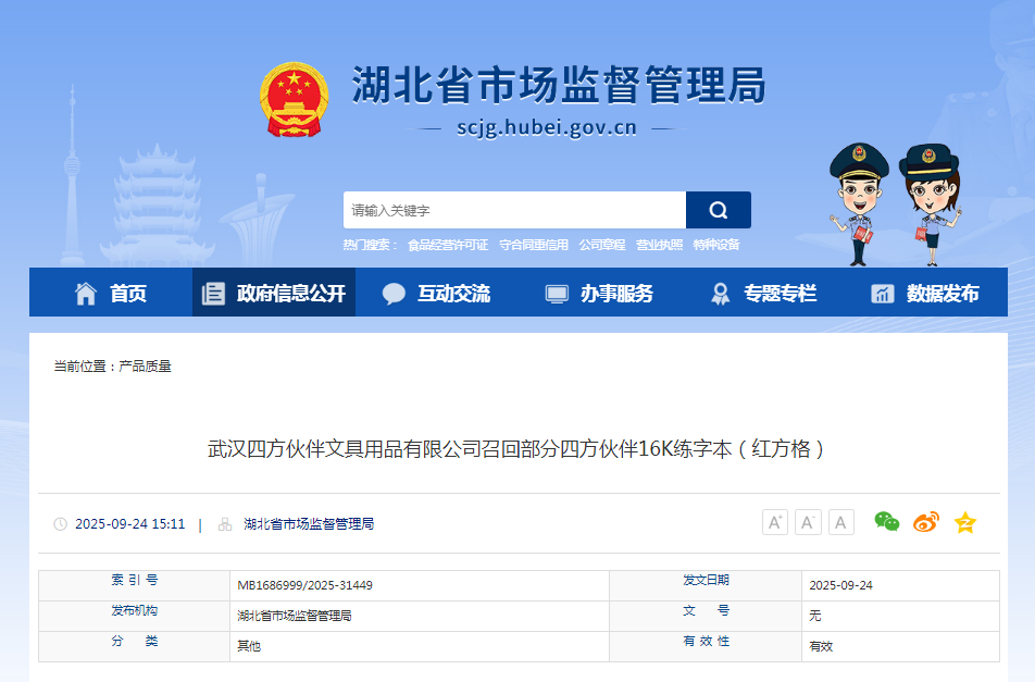 中國質(zhì)量新聞網(wǎng)訊 據(jù)湖北省市場監(jiān)管局網(wǎng)站消息,日前,武漢四方伙伴文具用品有限公司按照《消費(fèi)品召回管理暫行規(guī)定》的要求,主動(dòng)向湖北省市場監(jiān)督管理局備案了召回計(jì)劃,將自即日起,召回2019年6月3日-2020年1月5日生產(chǎn)的四方伙伴16K練字本(紅方格),型號/規(guī)格:HB16-001,190mm*265mm,涉及數(shù)量為1350本。
