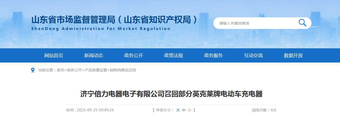 中國質(zhì)量新聞網(wǎng)訊 據(jù)山東省市場監(jiān)督管理局網(wǎng)站消息,日前,濟(jì)寧倍力電器電子有限公司受缺陷調(diào)查影響按照《消費(fèi)品召回管理暫行規(guī)定》的要求,主動向山東省市場監(jiān)督管理局報(bào)告了召回計(jì)劃,將自即日起,召回2023年6月5日制造的部分英克萊牌型號DZQS602001-C 電動車充電器,涉及數(shù)量為20個(gè)。