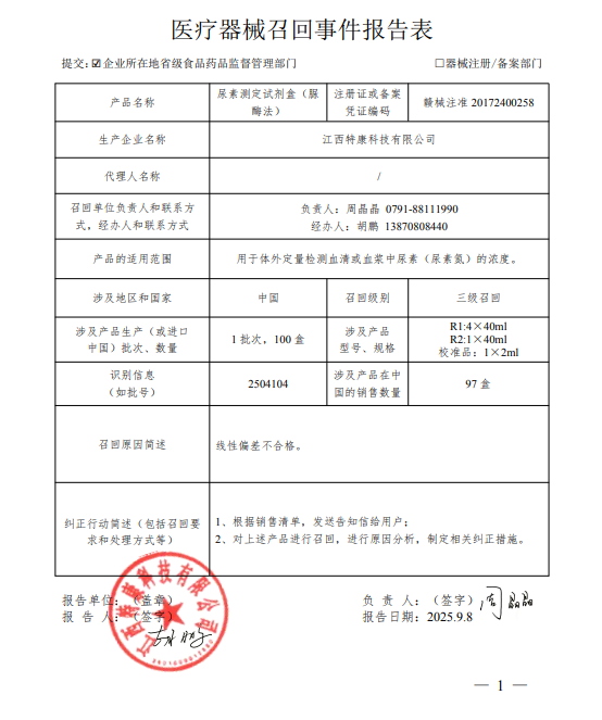 江西特康科技有限公司報告,由于線性偏差不合格等原因,江西特康科技有限公司對其生產的尿素測定試劑盒(脲酶法)(注冊備案號:贛械注準20172400238)主動召回,召回級別為三級,涉及產品的型號、規格及批次等詳細信息見《醫療器械召回事件報告表》。