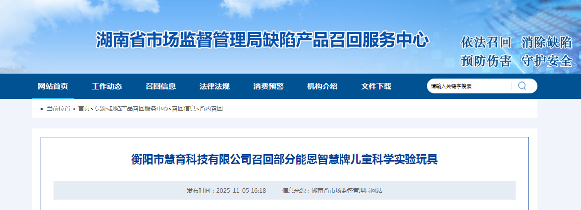 中國質量新聞網訊 據湖南省市場監督管理局缺陷產品召回服務中心網站消息,日前,衡陽市慧育科技有限公司按照《消費品召回管理暫行規定》的要求,主動向湖南省市場監督管理局報告了召回計劃,將自即日起,召回2024年5月28日生產的能恩智慧牌型號/規格為HA-D02兒童科學實驗玩具,涉及數量為300個。