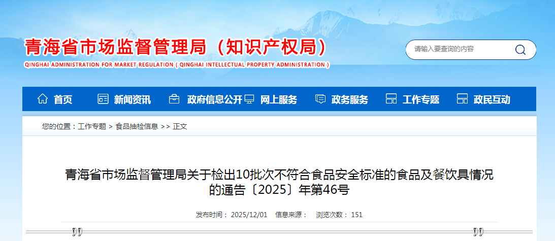 青海省市場監督管理局關于檢出10批次不符合食品安全標準的食品及餐飲具情況的通告〔2025〕年第46號