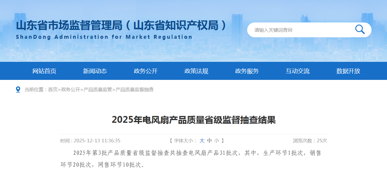 中國質量新聞網訊 據山東省市場監督管理局網站消息,近日,山東省市場監督管理局公布2025年電風扇產品質量省級監督抽查結果。2025年第3批產品質量省級監督抽查共抽查電風扇產品31批次,其中,生產環節1批次,銷售環節20批次,網售環節10批次。