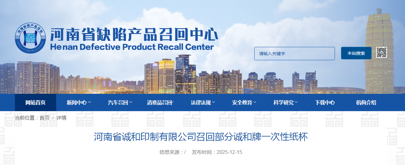 中國質量新聞網訊 據河南省缺陷產品召回中心網站消息,日前,河南省誠和印制有限公司按照《消費品召回管理暫行規定》的要求,主動向河南省市場監督管理局、鄭州市市場監督管理局報告了召回計劃,將自即日起,召回2025年8月9日制造的部分誠和牌一次性紙杯,型號/規格:250mL(50只/包),涉及數量為400包(20000只)。