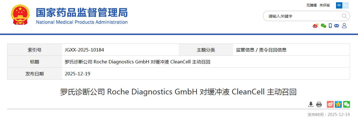 羅氏診斷公司 Roche Diagnostics GmbH 對緩沖液 CleanCell 主動召回羅氏診斷產(chǎn)品(上海)有限公司報告,羅氏診斷總部確認(rèn)批次為916860,916861和916863的緩沖液CleanCell存在質(zhì)量控制結(jié)果信號降低的問題。調(diào)查顯示只有上述三個批次受到影響,目前沒有與此問題相關(guān)的患者傷害報告。生產(chǎn)商羅氏診斷公司 Roche Diagnostics GmbH 對其生產(chǎn)的緩沖液 CleanCell (國械備20150053)主動召回。召回級別為二級召回。涉及產(chǎn)品的型號、規(guī)格及批次等詳細(xì)信息見《醫(yī)療器械召回事件報告表》。