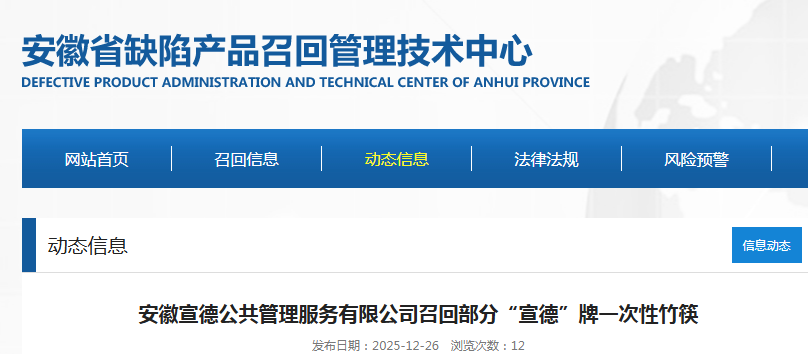 中國質量新聞網訊 據安徽省缺陷產品召回管理技術中心網站消息,日前,安徽宣德公共管理服務有限公司按照《消費品召回管理暫行規定》要求,主動向安徽省市場監督管理局、宣城市市場監督管理局報告了召回計劃,將自即日起,召回2025年1月1日至2025年6月1日生產的“宣德”牌一次性竹筷,涉及數量為5000包(400雙/包)。