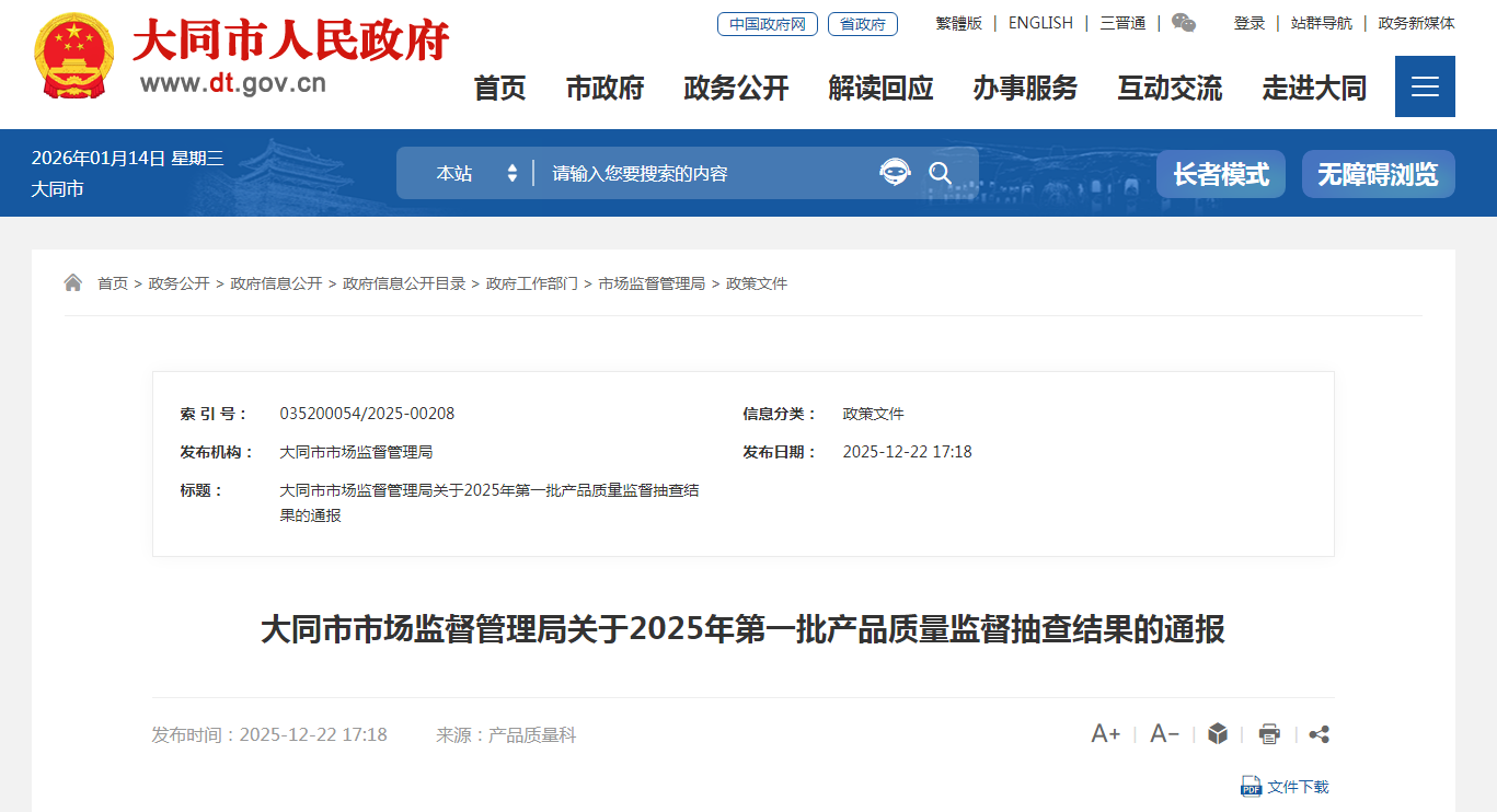 大同市市場監(jiān)督管理局關于2025年第一批產(chǎn)品質(zhì)量監(jiān)督抽查結果的通報.docx