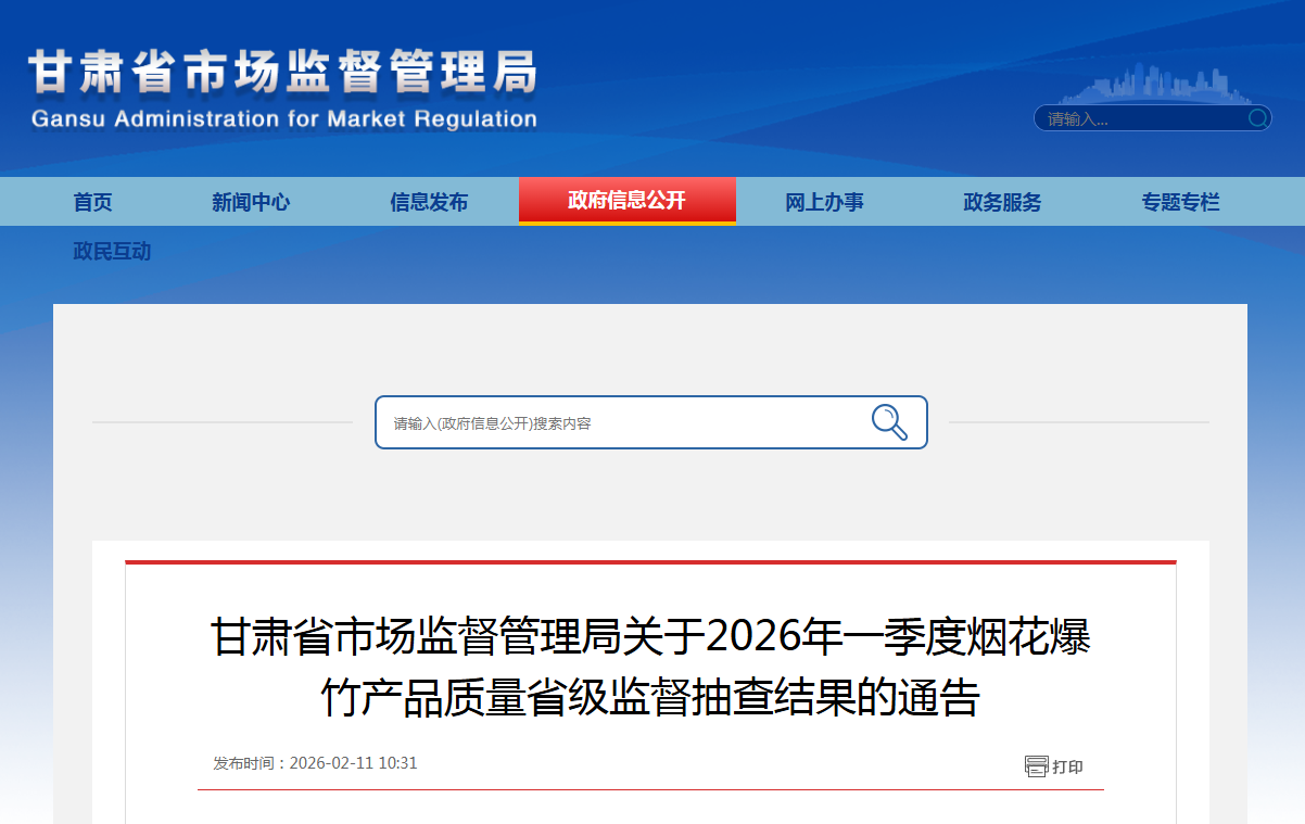 中國質量新聞網訊 據甘肅省市場監督管理局網站消息,為切實保障人民群眾生命財產安全,規范煙花爆竹市場秩序,營造安全祥和的節日氛圍,依據《中華人民共和國產品質量法》及《煙花爆竹安全與質量》等國家標準,2025年12月至2026年1月,甘肅省市場監督管理局對煙花爆竹產品組織開展了產品質量省級監督抽查。現將有關抽查情況通告如下: