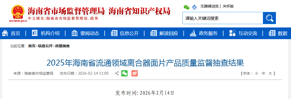 中國質(zhì)量新聞網(wǎng)訊 據(jù)海南省市場監(jiān)督管理局網(wǎng)站消息,2025年第4季度,海南省市場監(jiān)督管理局對全省流通領(lǐng)域離合器面片產(chǎn)品進行了監(jiān)督抽查。本次抽查了15批次產(chǎn)品,經(jīng)檢驗,不合格1批次。