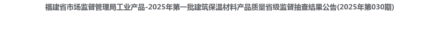中國質量新聞網訊 近日,福建省市場監督管理局網站公布2025年第一批建筑保溫材料產品質量省級監督抽查結果(2025年第030期)。本期共抽查36家企業36批次,其中合格批次29個,不合格批次7個。