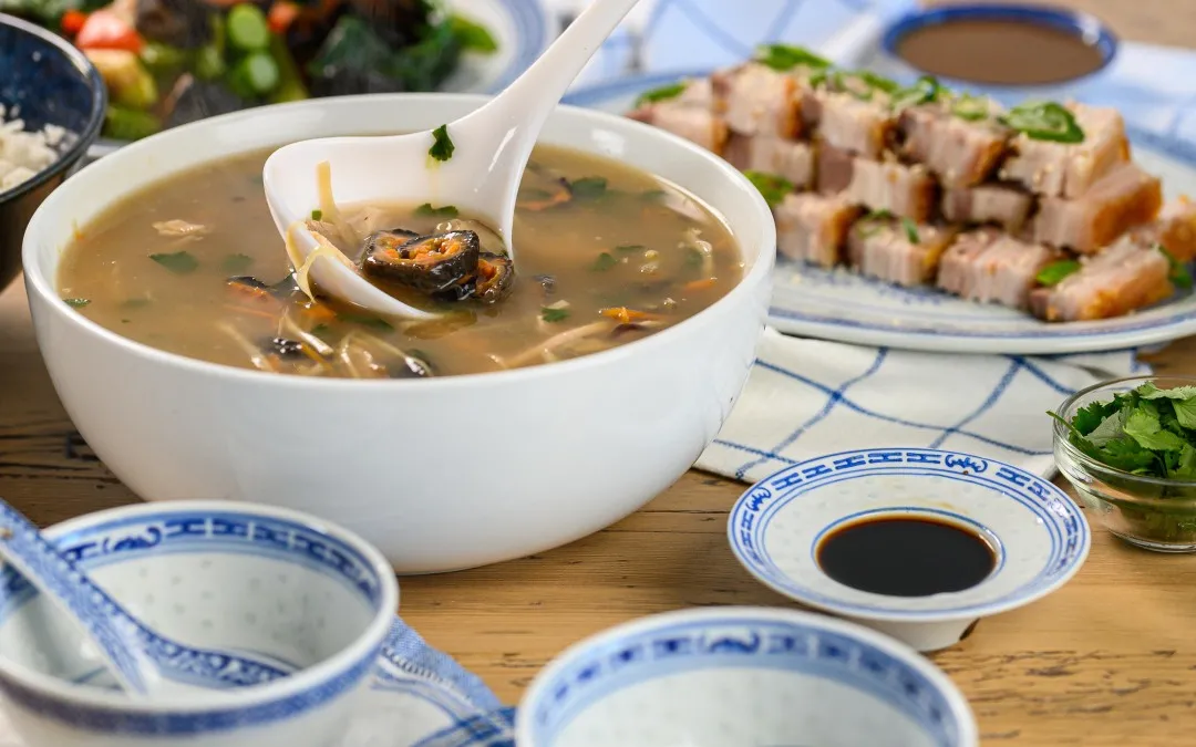 材料:30克姜(切絲),100克香菇(切絲),200克熟的手撕雞肉,150克胡蘿卜(切絲),150克竹筍(切絲),2杯(500ml)雞高湯,150-200克海參(預先泡發后切絲),3杯(750ml)水,2小匙(10g)鹽,1小匙(5g)糖,2小匙(5ml)蠔油,20克香菜,水淀粉5g(玉米淀粉加水攪拌),香油少許。