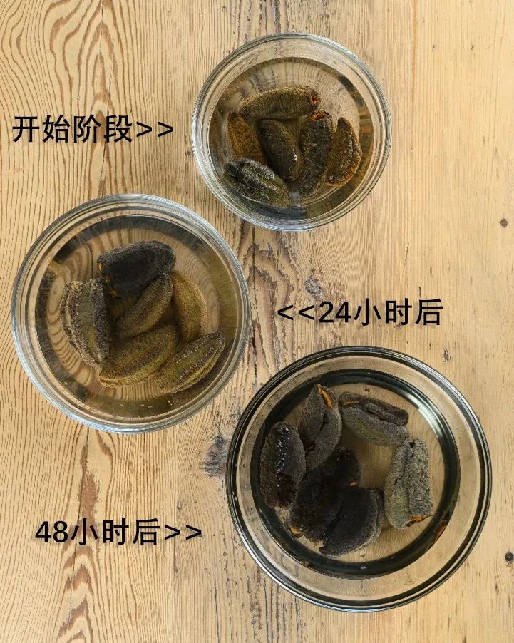 2,將干海參在純凈水/蒸餾水中浸泡24小時。