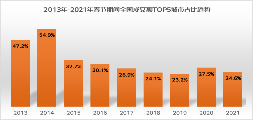 在消費層面,春節期間的消費活力被進一步激發。從消費人群看,更多消費者尤其是下沉市場的消費者享受到更具時效性的物流服務;從消費結構看,隨著快遞業務的持續拓展,春節消費與日常消費越來越接近。可以說,只要基礎設施和服務到位,消費者的消費需求就能夠得到全方位釋放。2013年-2021年春節期間消費趨勢顯示,地域購買集中度呈現明顯的下降趨勢,除2020年受疫情影響小幅反彈提升外,基本集中度維持在24%上下。