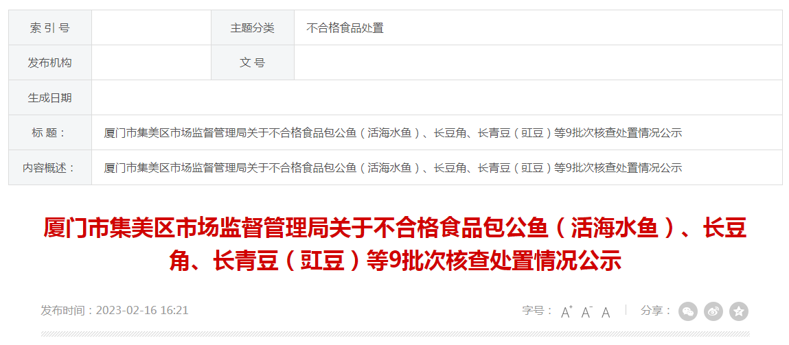 中國質量新聞網訊 近日,廈門市集美區市場監督管理局公示不合格包公魚(活海水魚)、長豆角、長青豆(豇豆)等9批次食品核查處置情況。其中,對包公魚(活海水魚)核查處置情況如下: