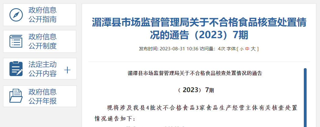 現將涉及我縣4批次不合格食品3家食品生產經營主體有關核查處置情況通告如下:
