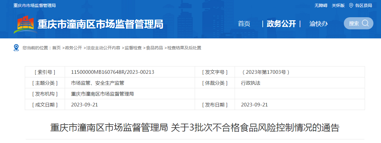 重慶市潼南區(qū)市場(chǎng)監(jiān)督管理局關(guān)于3批次不合格食品風(fēng)險(xiǎn)控制情況的通告