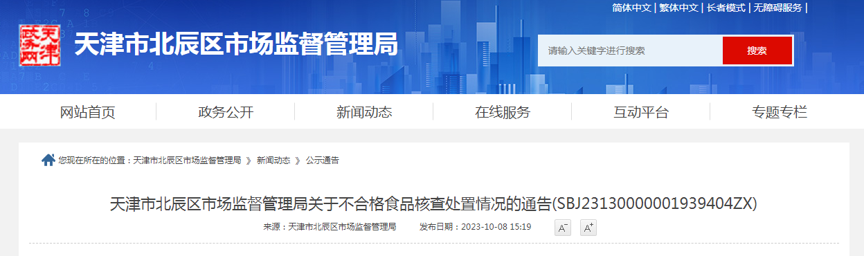 天津市北辰區市場監督管理局關于不合格食品核查處置情況的通告(SBJ23130000001939404ZX)