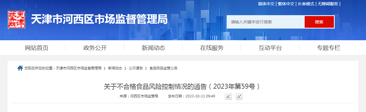 中國質量新聞網訊 10月11日,天津市河西區市場監管局網站發布關于不合格食品風險控制情況的通告(2023年第59號)。