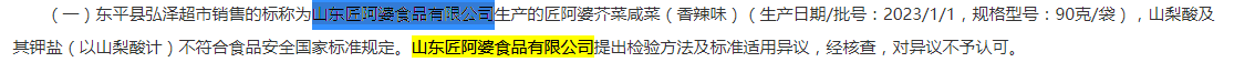 通告顯示,標稱山東匠阿婆食品有限公司生產的匠阿婆芥菜咸菜(香辣味)【生產(購進或檢疫)日期/批號:2023/1/1】【規格型號:90克/袋】抽檢不合格,涉及山梨酸及其鉀鹽(以山梨酸計)項目不符合標準規定。