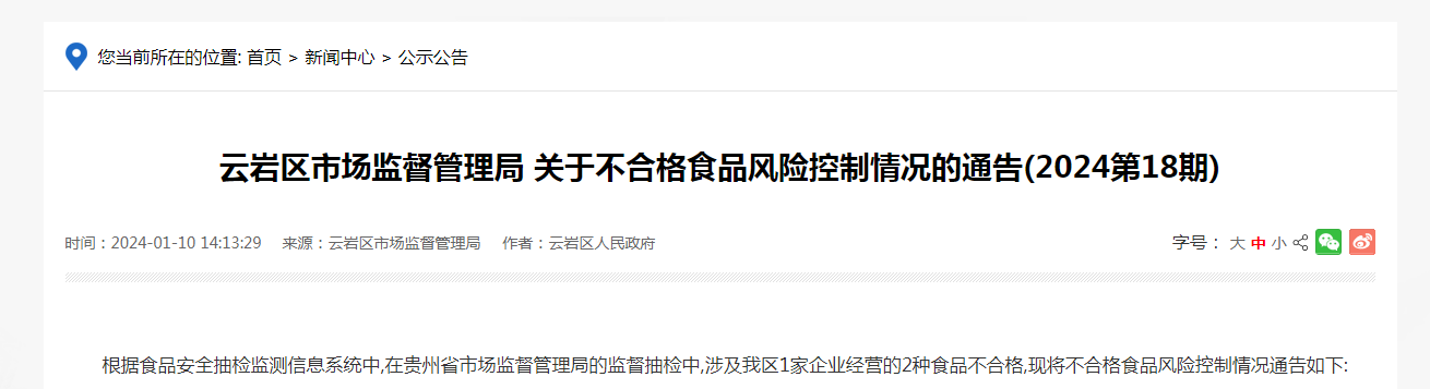 云巖區市場監督管理局關于不合格食品風險控制情況的通告(2024第18期)