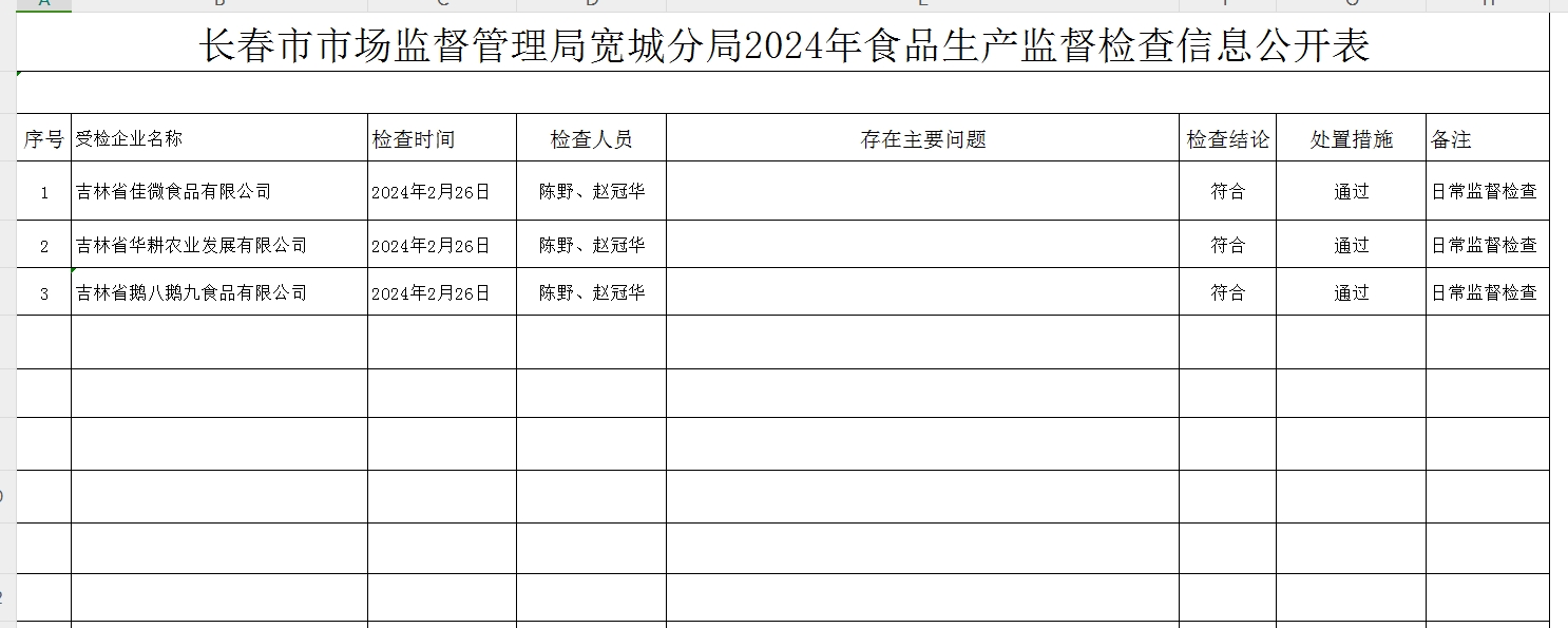 長春市市場監督管理局寬城分局2024年食品生產監督檢查信息公開表