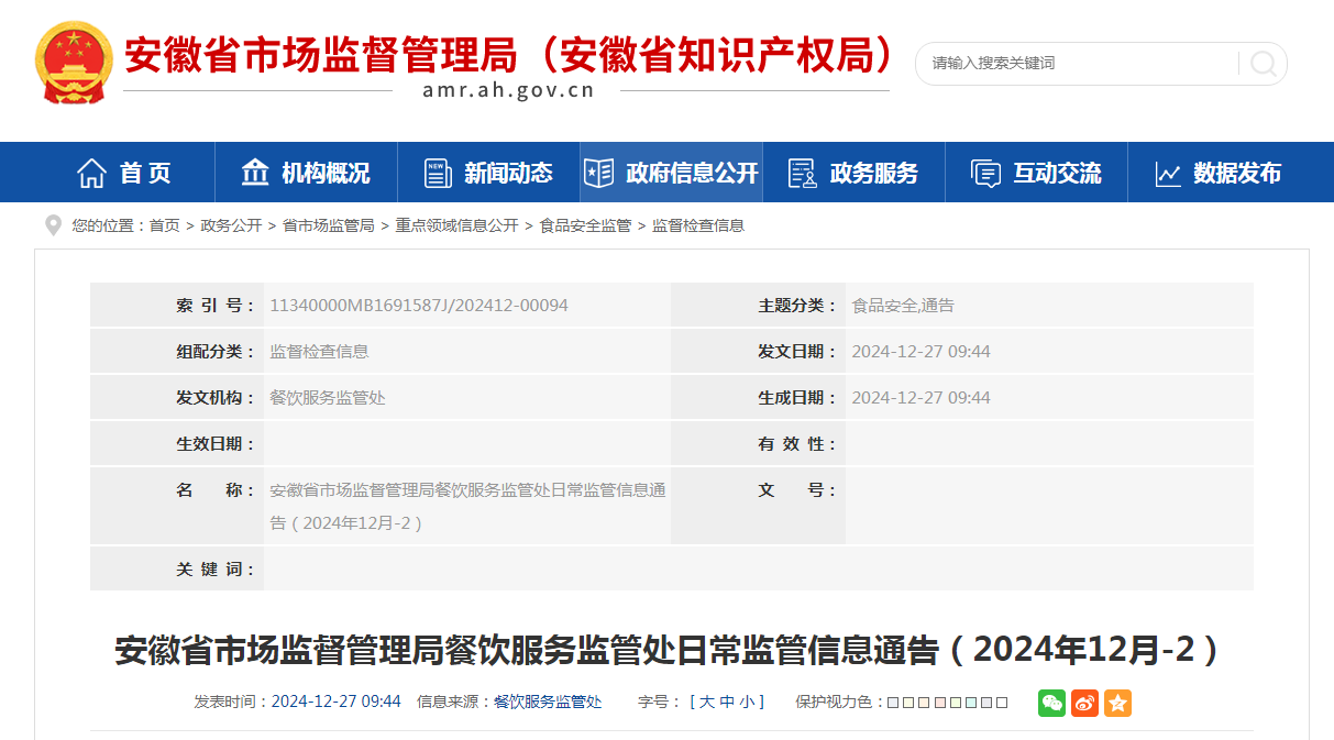 安徽省市場監督管理局餐飲服務監管處日常監管信息通告(2024年12月-2)