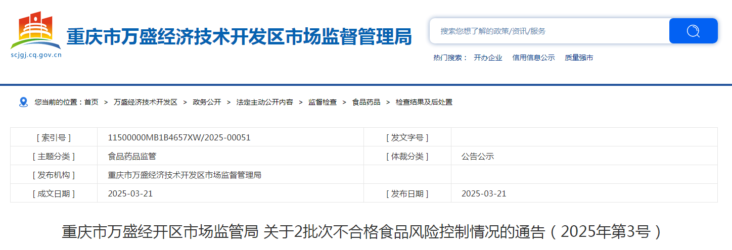 重慶市萬盛經開區市場監管局關于2批次不合格食品風險控制情況的通告(2025年第3號)