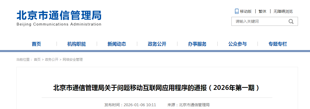 北京市通信管理局關于問題移動互聯網應用程序的通報(2026年第一期)