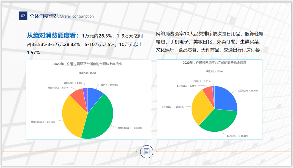 調(diào)查顯示,網(wǎng)絡(luò)新消費(fèi)成為擴(kuò)大內(nèi)需的主力軍,近九成受訪者表示自己這一年網(wǎng)絡(luò)消費(fèi)的頻率和金額都比去年增長。其中,網(wǎng)絡(luò)消費(fèi)次數(shù)和金額比上年增長30%以上的分別為40%和43.39%,增長50%以上的分別為10.78和9.12%;增長一倍以上的分別有3.45%和3.29%。