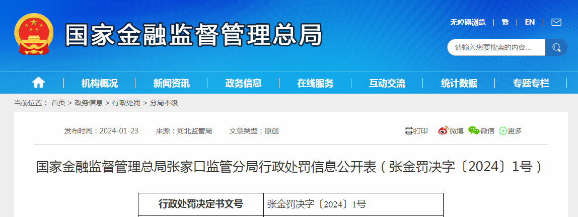國家金融監督管理總局張家口監管分局行政處罰信息公開表(張金罰決字〔2024〕1號)