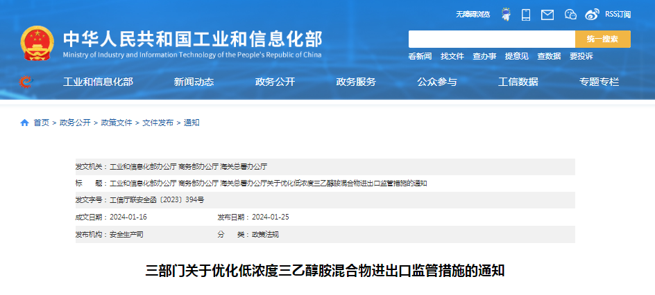 工業和信息化部辦公廳 商務部辦公廳 海關總署辦公廳關于優化低濃度三乙醇胺混合物進出口監管措施的通知