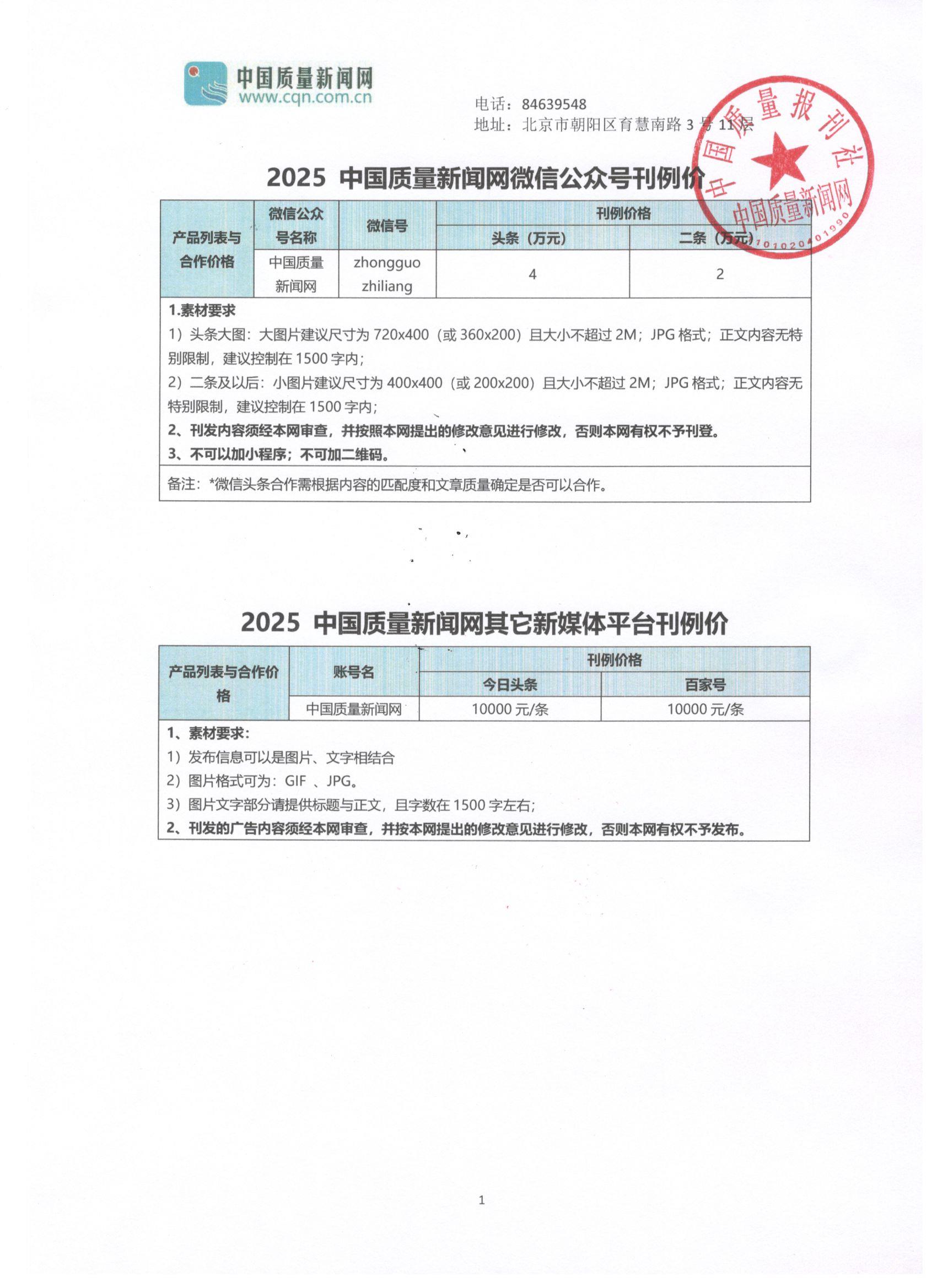 中國質量新聞網2025年廣告刊例