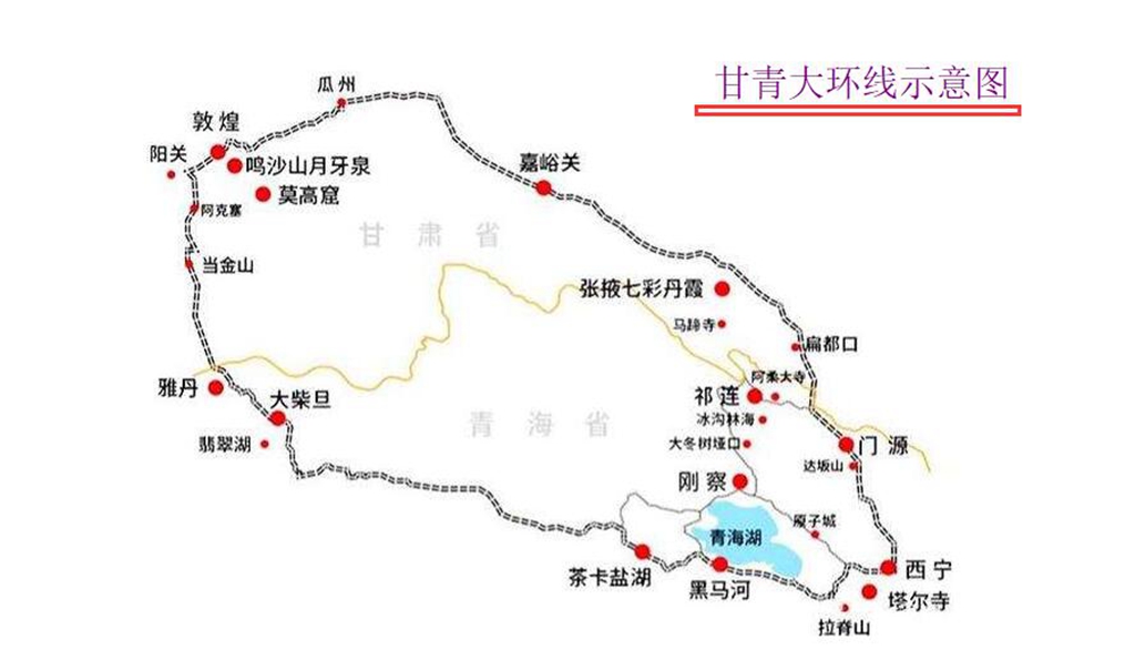 2020年夏末秋初,我們報團參加青甘大環線之旅。這條線路跨越青海甘肅兩個省份,走下來大約3000公里。接下來的7天6晚行程,我們從青藏鐵路起點的西寧出發,向東北方向深入柴達木盆地,翻越祁連山,進入河西走廊,覽七彩丹霞地貌、賞大漠清泉奇觀,訪敦煌莫高洞窟,經過嘉峪雄關,玉門故地和陽關遺址進入青海,看高原“三湖”勝景,看塔爾寺內“三絕”。如果對照網絡上可以查看到的大環線線路圖,我們是按逆時針路徑走下來的。