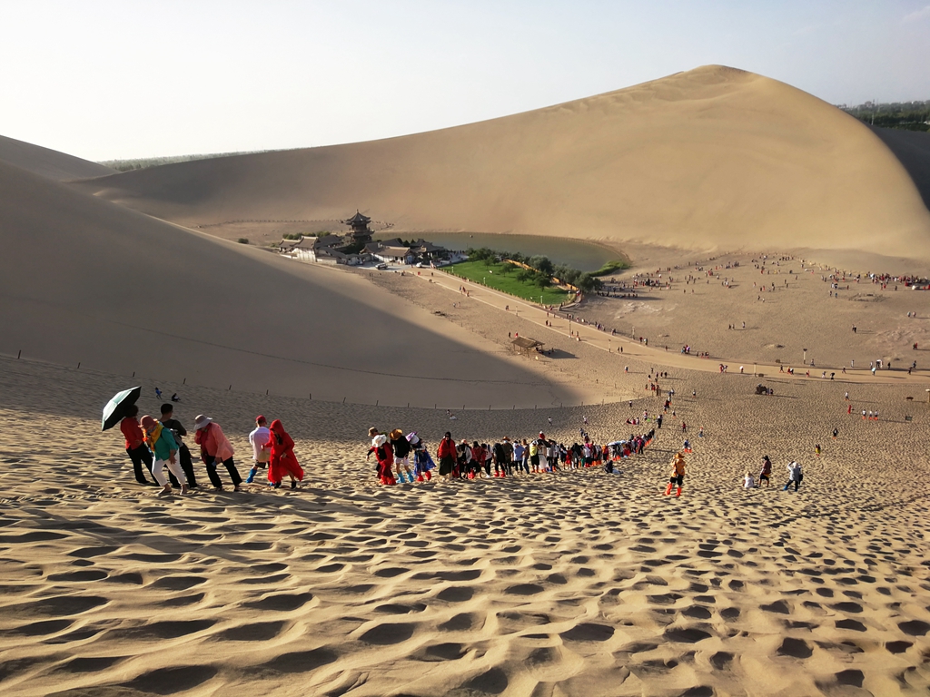 鳴沙山月牙泉。沙山因為泉水獲得靈性,泉水因為沙山更加珍貴!不善詩詞的我在登上沙山后,氣喘吁吁地想到了這么兩句話。