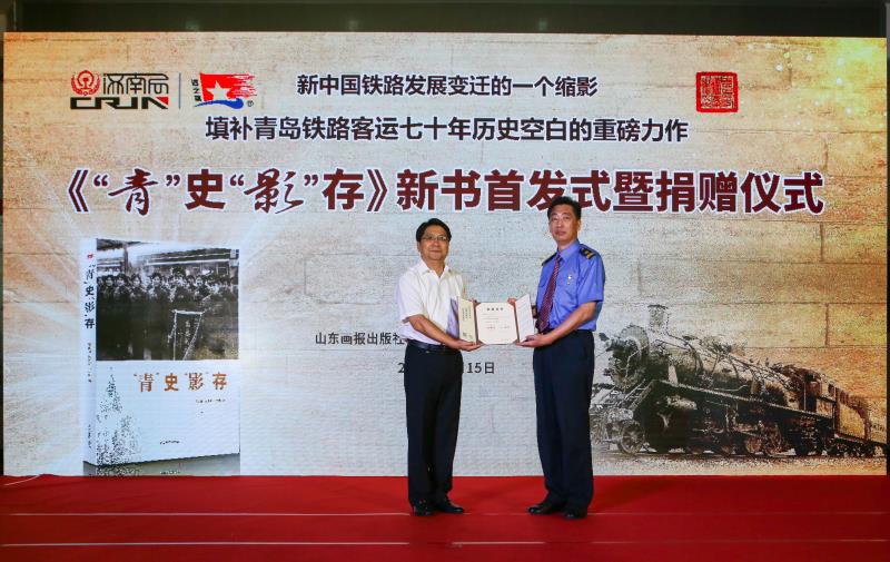 青島客運段黨委書記吳松濤代表青島客運段接過檔案館館長姜永河頒發的捐贈證書。