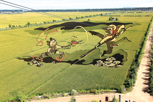 日前,遼寧沈陽市沈新區興錫伯龍地創意農業產業園內的“3D稻田畫”進入最佳觀賞期。據悉,“稻田畫”利用先進的3D技術和透視技術,種植不同品種有著不同顏色葉子的水稻,繪制出平面、立體、鏤空、線條4種不同風格的畫面。