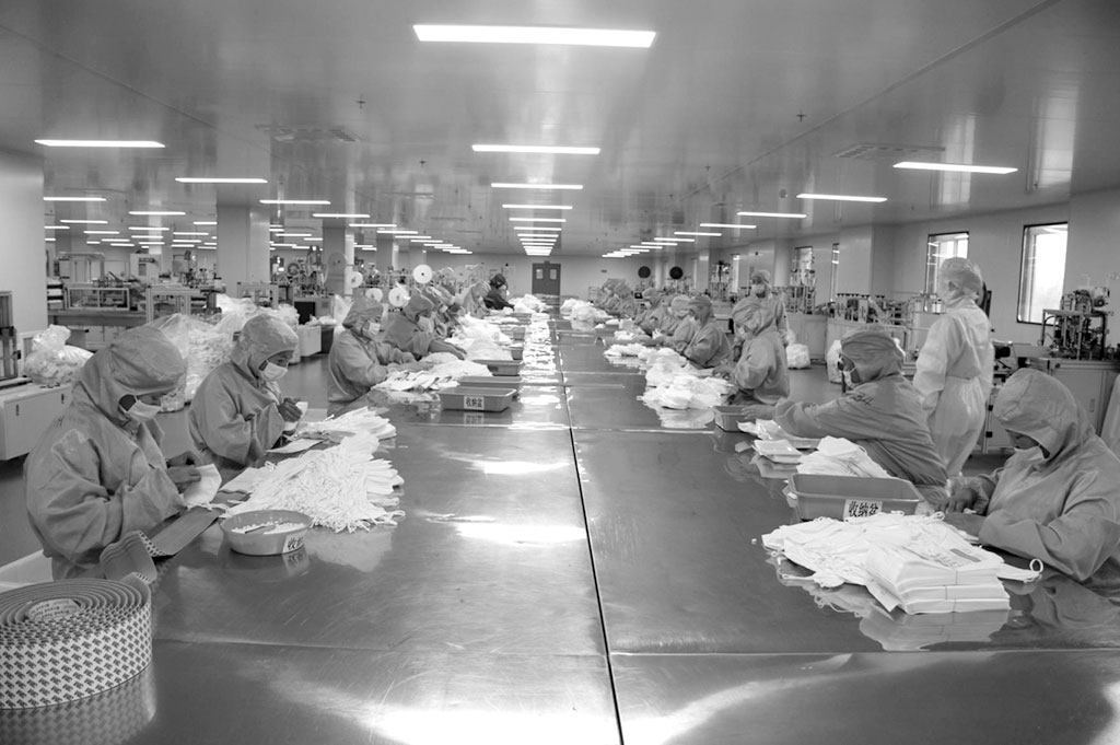 次日上午9時,在健琪醫療“抓生產,保供應,抗疫情”動員會上,田書增號召大家終止假期返崗,及早恢復生產。經過動員和部署,由分管副總、各部門負責人通知生產口罩、防護服等抗疫物資的車間工人當日到廠復工生產。結果,除兩名家在外地的員工沒有趕到外,其他員工全部到廠,當晚7時,各個生產車間全部開機,恢復生產。