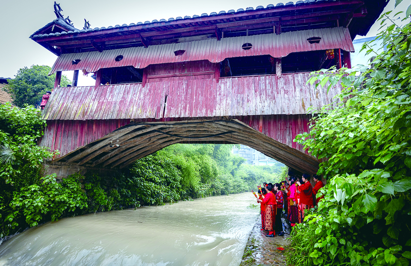 ▲ 12月5日,在巴拉圭召開的聯合國教科文組織保護非物質文化遺產政府間委員會第19屆常會通過評審,決定將“黎族傳統紡染織繡技藝”“羌年”“中國木拱橋傳統營造技藝”從急需保護的非物質文化遺產名錄轉入人類非物質文化遺產代表作名錄。圖為6月11日,村民在浙江省麗水市慶元縣古廊橋雙門橋參加非遺端午走橋民俗活動。 吳春平 攝