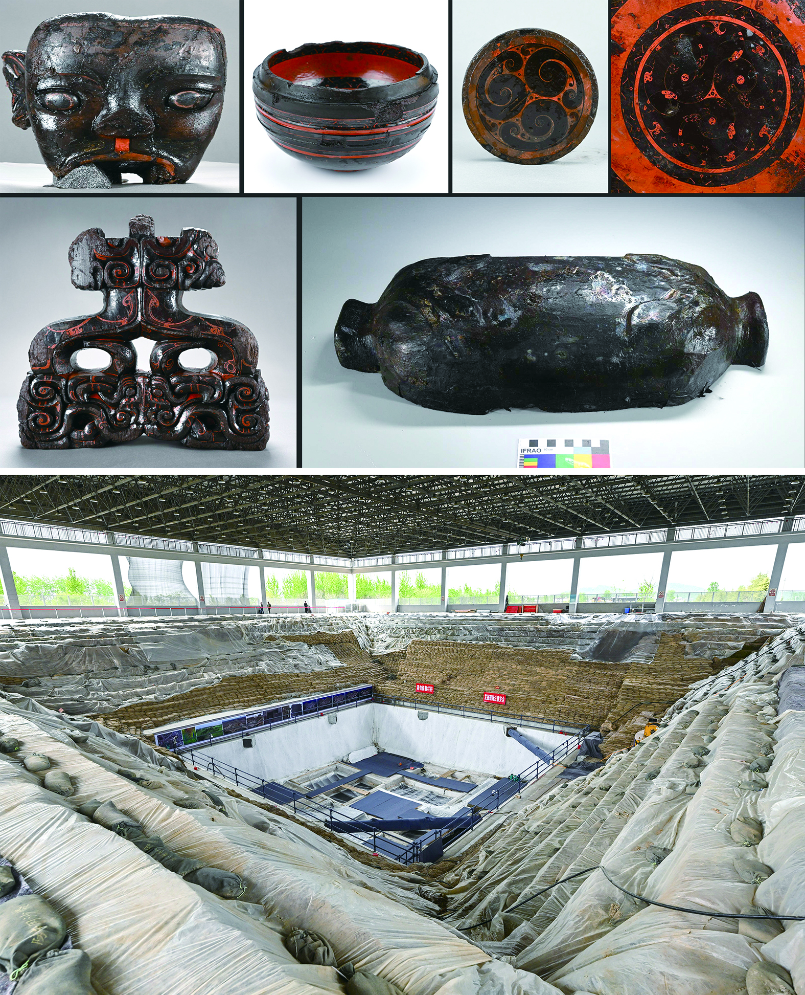 ▲ 安徽淮南武王墩主墓是經科學發掘的迄今規模最大、等級最高、結構最復雜的大型楚國高等級墓葬。專家認為,結合墓葬規模、結構、出土文字材料與文獻史料等綜合分析,武王墩墓主身份可能是《史記·楚世家》記載的楚考烈王。拼版照片:上圖為武王墩主墓室出土的部分漆器(安徽省文物考古研究所供圖),下圖為武王墩一號大墓發掘現場。