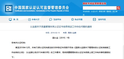 中國質量新聞網訊 2019年2月15日,國家認監委網站發布《認監委關于質量管理體系認證證書信息報送工作存在問題的通報》。據通報,截至2018年12月,共有72家認證機構報送的5084張證書信息不符合《國家認監委關于管理體系認證標準換版工作安排的公告》(認監委公告2015年第30號)的工作要求。