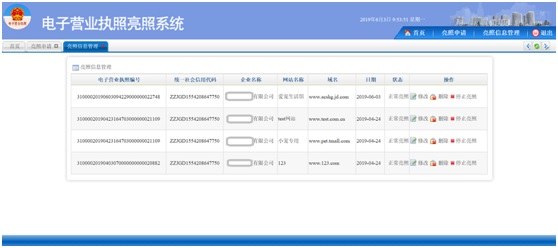 電子營業執照亮照系統為市場主體提供亮照信息管理功能,包括修改、刪除、停止亮照/恢復亮照等。