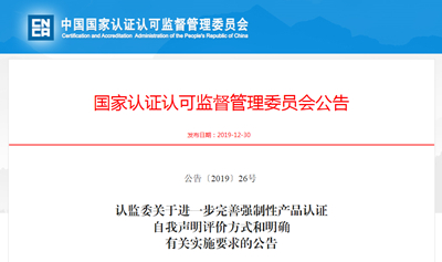 中國(guó)質(zhì)量新聞網(wǎng)訊? 2019年12月30日,國(guó)家認(rèn)監(jiān)委官網(wǎng)發(fā)布公告稱,為落實(shí)“放管服”改革要求,推動(dòng)強(qiáng)制性產(chǎn)品認(rèn)證(CCC)自我聲明評(píng)價(jià)方式順利實(shí)施,持續(xù)強(qiáng)化市場(chǎng)主體責(zé)任,經(jīng)全面評(píng)估CCC自我聲明評(píng)價(jià)方式實(shí)施情況,現(xiàn)對(duì)CCC自我聲明評(píng)價(jià)方式進(jìn)一步完善并明確有關(guān)要求如下: