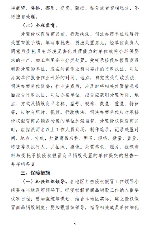 打擊侵權假冒事關人民群眾切身利益,事關創新型國家建設,事關經濟高質量發展。依法銷毀侵權假冒商品,是維護人民群眾生命安全和身體健康的有效措施,是凈化市場環境、對侵犯知識產權違法犯罪形成強大震懾效應的有效手段,是激發創新創業熱情、助力經濟高質量發展的有效途徑。為做好侵權假冒商品銷毀工作,全國打擊侵犯知識產權和制售假冒偽劣商品工作領導小組辦公室、中央宣傳部、最高人民法院、最高人民檢察院、公安部、生態環境部、文化和旅游部、海關總署、國家市場監督管理總局研究制定了《關于加強侵權假冒商品銷毀工作的意見》,現印發你們,請認真貫徹落實。