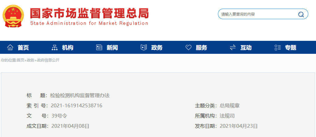 《檢驗檢測機構監督管理辦法》已經2021年3月25日國家市場監督管理總局第5次局務會議審議通過,現予公布,自2021年6月1日起施行。