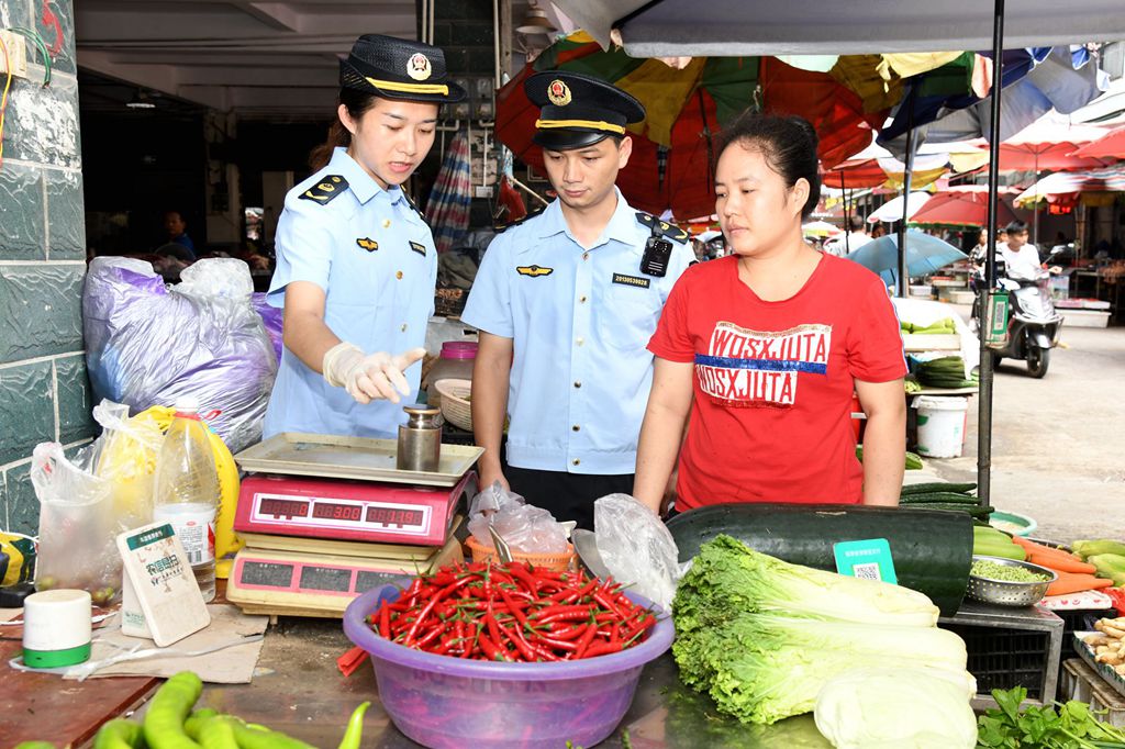 金秀瑤族自治縣市場監管局工作人員在農貿市場為蔬菜經營者檢定電子計價秤。