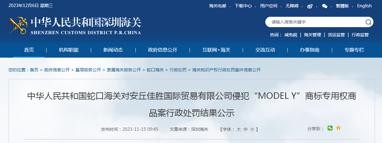 中華人民共和國(guó)蛇口海關(guān)對(duì)安丘佳勝國(guó)際貿(mào)易有限公司侵犯“MODEL Y”商標(biāo)專用權(quán)商品案行政處罰結(jié)果公示.pdf