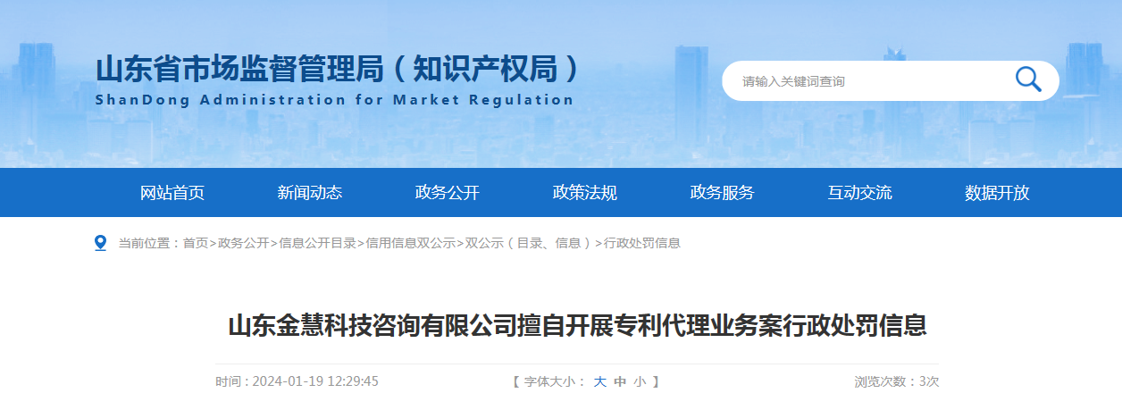 山東金慧科技咨詢(xún)有限公司 | 法人及非法人組織 | 91370100MA3UU4PH2D | 李雪雪 | 身份證 | 370123199302266221 | 魯市監(jiān)行處字〔2024〕2號(hào) | 擅自開(kāi)展專(zhuān)利代理業(yè)務(wù) | 2021年9月至2023年9月,當(dāng)事人與十個(gè)專(zhuān)利申請(qǐng)人達(dá)成協(xié)議,代為撰寫(xiě)并提交專(zhuān)利申請(qǐng)材料。構(gòu)成了在未取得專(zhuān)利代理機(jī)構(gòu)執(zhí)業(yè)資質(zhì)的情況下,擅自開(kāi)展專(zhuān)利代理業(yè)務(wù)的行為。當(dāng)事人代理專(zhuān)利申請(qǐng)共32件,向?qū)@暾?qǐng)人收取了代理服務(wù)費(fèi)54350元;支付了專(zhuān)利申請(qǐng)費(fèi)12155元、代寫(xiě)代報(bào)管理費(fèi)34700元和稅費(fèi)1223.13元,違法所得共計(jì)6271.87元。 | 《專(zhuān)利代理?xiàng)l例》 | 沒(méi)收違法所得;罰款 | 1.沒(méi)收違法所得6271.87元; | 1.254374 | 0.627187 | 2024/01/10 | 2024/01/10 | 2027/01/10 | 山東省市場(chǎng)監(jiān)督管理局 | 11370000MB2853699N | 山東省市場(chǎng)監(jiān)督管理局 | 11370000MB2853699N | 3 | 一般程序 |