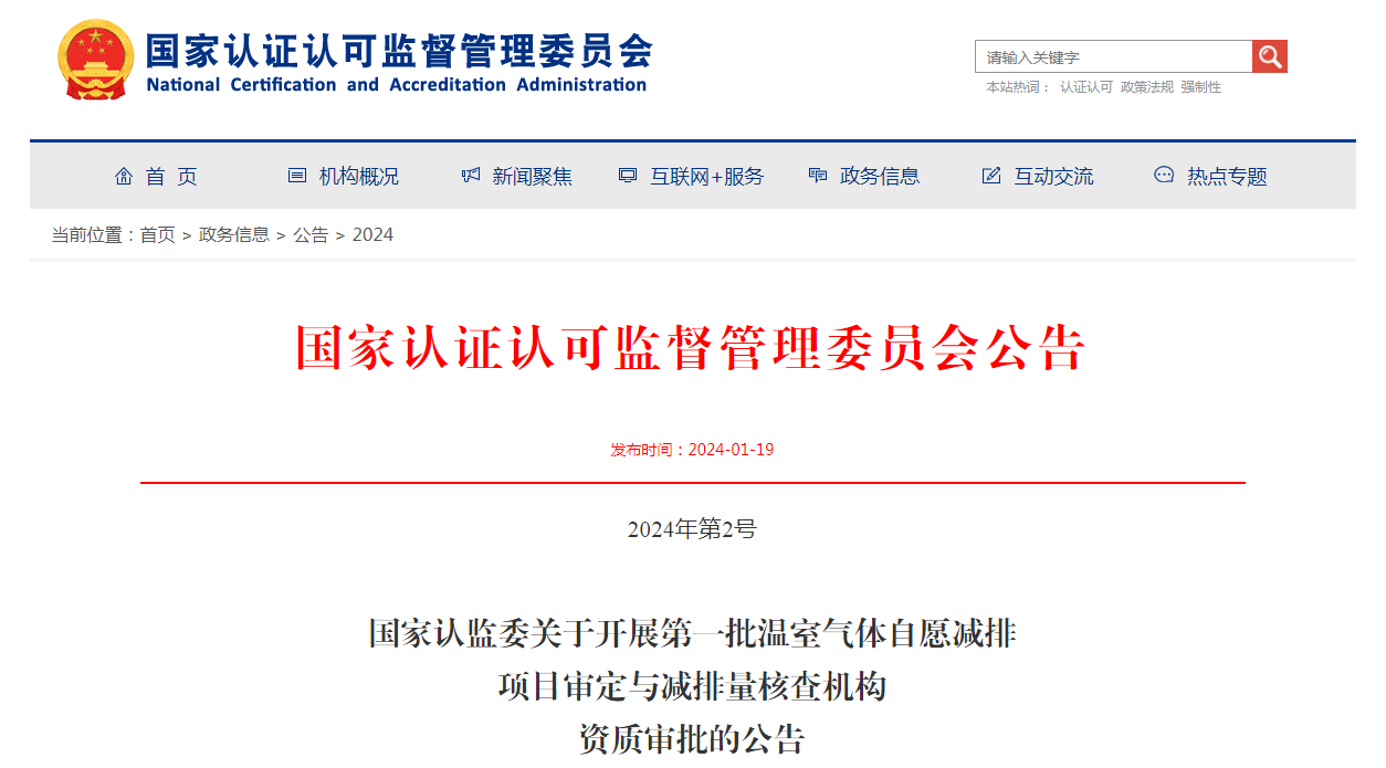 國家認監委關于開展第一批溫室氣體自愿減排項目審定與減排量核查機構資質審批的公告