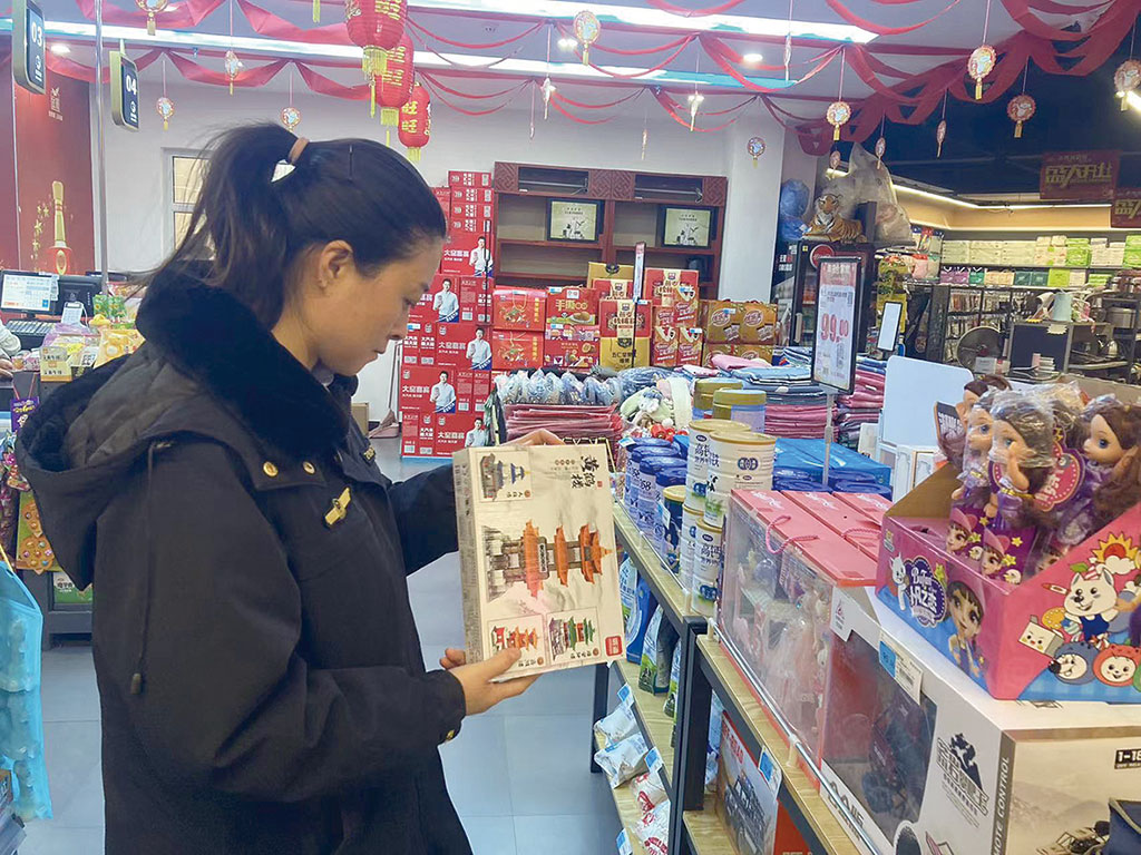 春節臨近,安徽淮北市相山區市場監管部門為維護市場秩序,開展節日期間穩價保質專項執法行動。圖為執法人員正在檢查節日飾品質量和價格情況。李 鑫 謝可為 文/攝