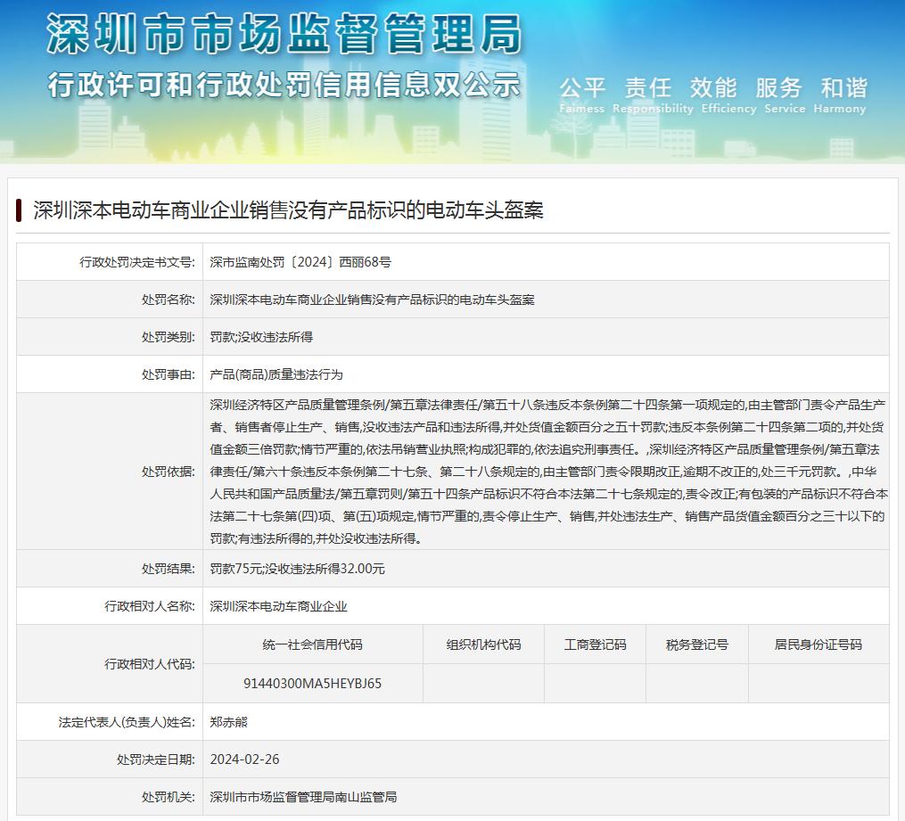 深圳深本電動車商業企業銷售沒有產品標識的電動車頭盔案